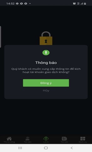 Bước 5: Hệ thống sẽ hỏi “Quý khách có muốn cung cấp thông tin để kích hoạt mở tài khoản giao dịch không”. Vui lòng chọn “Đồng ý” để tiếp tục