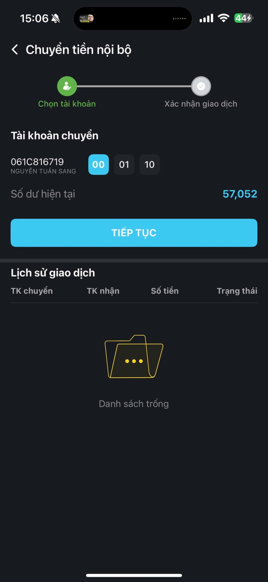 Bước 2: Tài khoản chuyển chọn 00 sau đó chọn TIẾP TỤC