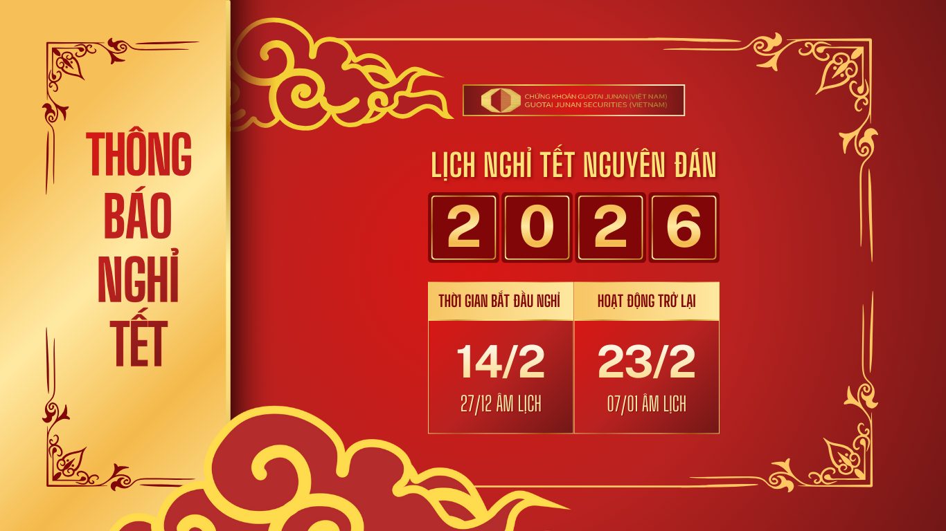 Công ty Cổ phần Chứng khoán Guotai Junan (Việt Nam) trân trọng thông báo đến Quý Khách hàng & Quý Đối tác lịch nghỉ Tết Nguyên Đán 2026 như sau: