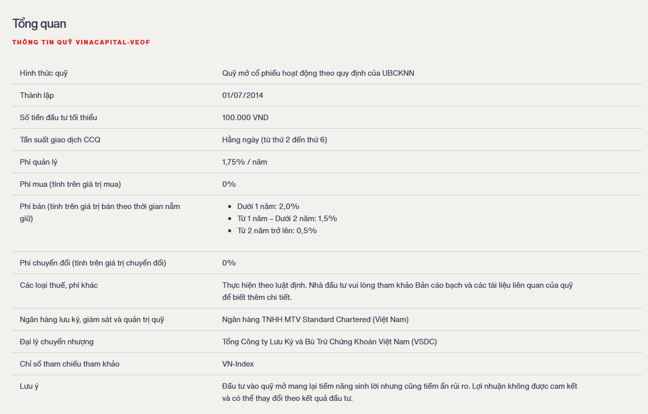 Quỹ VINACAPITAL-VEOF đầu tư chủ yếu vào các cổ phiếu niêm yết của các doanh nghiệp đầu ngành, có lợi thế cạnh tranh khác biệt và có tiềm năng tăng trưởng tốt.